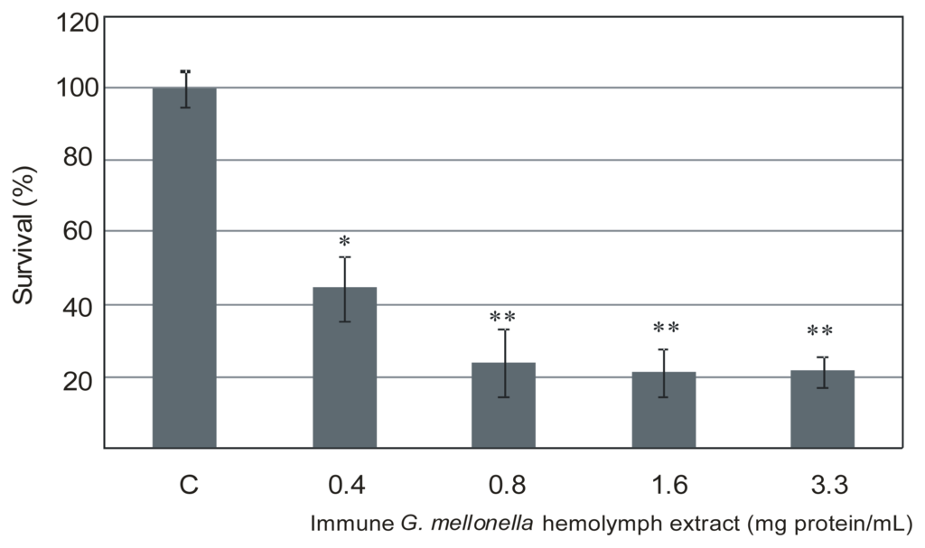 Figure 1. Growth inhibition of L. dumoffii by G. mellonella immune hemolymph extract. The bacteria were incubated with the extract at the concentrations 0.4–3.3 mg/mL (total protein) for 1 h, as described in the Experimental Section. Next, the cells were seeded on the agar plates, and the growing colonies were counted. Survival of the untreated cells was regarded as 100% (C; control). Statistical significance: * p < 0.05; ** p < 0.01.