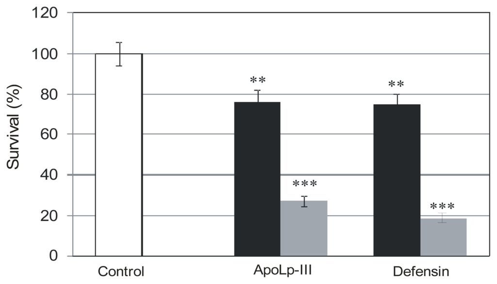 Figure 2. The effects of G. mellonella apoLp-III and defensin on L. dumoffii survival and influence of choline supplementation on the activity of the antimicrobial factors. The bacteria cultured on the non-supplemented (black bars) and choline-supplemented (grey bars) medium were exposed to Galleria defensin (40 μg/mL) or apoLp-III (0.4 mg/mL), as described in the Experimental Section. After seeding of the bacteria on the agar plates, the growing colonies were counted. Survival of the untreated cells was regarded as 100% (C; control). The results are given as mean ± SD from three independent experiments. Statistical significance: ** p < 0.01; *** p < 0.001.