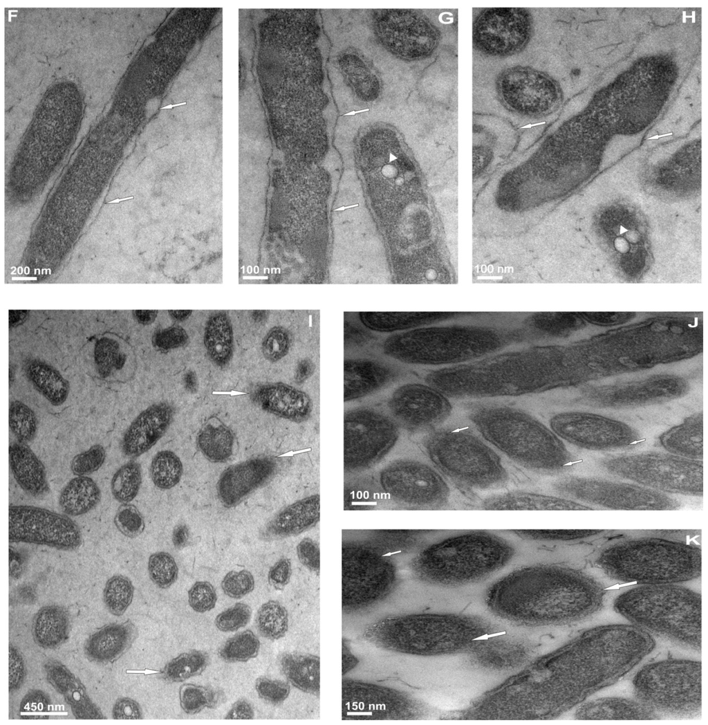 To demonstrate the direct effect of the extract of G. mellonella hemolymph on L. dumoffii cell morphology, the bacterial cells were observed by transmission electron microscopy. Microscopic observations of control cells (non-treated with the extract) revealed presence of small vacuoles, well discernible outer and inner membrane and cytoplasm containing numerous ribosomes. The cells were of longitudinal shape. The bacilli were usually 1.5 to 2.0 μm in length and 0.4 to 0.5 μm in diameter, and no infolding of the cytoplasmic membrane (“mesosomes”) was seen (Figure 3A–C). No changes in the structure were demonstrated in cell morphology of bacteria cultured on the choline-supplemented medium. All their organelles still had a typical appearance (Figure 3D,E). Microscopic examination of the bacteria treated with the extract of G. mellonella hemolymph revealed the presence of severe cell envelope damage with apparent local widening and changes in the cytoplasm appearance (Figure 3F–I). The cytoplasm was often granular and denser in comparison to the cytoplasm of the control cells. An enlarged periplasmatic space accompanying a locally widened envelope membrane was noted (Figure 3F,H). After the exposure of L. dumoffii to the G. mellonella extract, the shape of the bacteria was also modified. Additionally, loose attachment of the cell membrane was visible (arrows). The vacuoles were electron-lucent and surrounded by an electron-dense membrane (arrowheads) (Figure 3G,H). Similar changes, especially in the cell wall, were observed in bacterial cells cultured on the choline-supplemented medium after exposure to the G. mellonella extract. Distortion and loss of the cell wall in some parts of the cells were noted (Figure 3J,K).