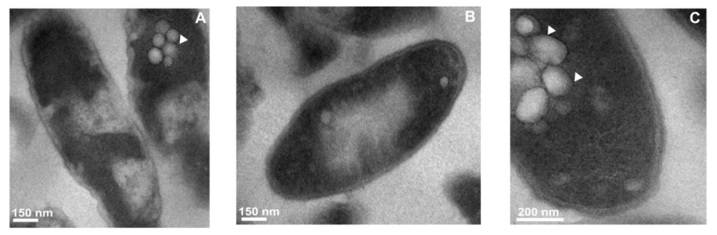 The bacterial cells exposed to G. mellonella hemolymph extract were gently scraped from the agar surface using the microbiological loop and collected into the vials containing 2% formaldehyde (freshly prepared from paraformaldehyde) and 2.5% glutaraldehyde dissolved in 0.1 M sodium cacodylate buffer (pH 7.4). Then, the cell suspension was centrifuged at 8000× g for 10 min. The cell pellets were fixed for 24 h at 4 °C in buffered glutaraldehyde and formaldehyde (2.5% and 2%, respectively). After rinsing several times with 0.1 M cacodylate buffer (pH 7.4), the cell pellets were post-fixed in a 1% osmium tetroxide solution in 0.1 M sodium cacodylate buffer (pH 7.4) for 2 h at 4 °C. The bacterial cells were dehydrated in a series of alcohol and acetone and embedded in LR White resin. Ultrathin sections (65 nm) were cut with a diamond knife on a microtome RMC MT-XL (Boeckeler Instruments, Tucson, AZ, USA) collected on copper grids and contrasted with the use of uranyl acetate and Reynold’s liquid. The samples were observed under a LEO-Zeiss 912 AB electron microscope (Carl Zeiss Microscopy, Oberkohen, Germany).