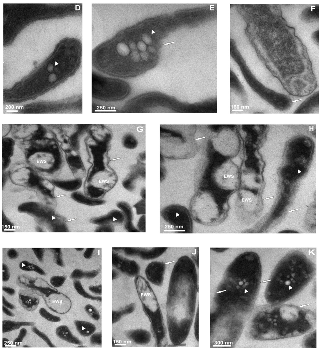 Figure 4. The influence of defensin and apolipophorin III isolated from G. mellonella hemolymph on the ultrastructure of L. dumoffii cells. The cells grown on the non-supplemented (AC,G,H) and choline-supplemented (DF,IK) medium were incubated in the presence of apoLp-III (AF) or Galleria defensin (GK). Then the cells were prepared for TEM analysis as described in the Experimental Section. (A,B) cells showing condensed cytoplasm, regions with decreased electron density and the presence of vacuoles (arrowhead); (C) a fragment of the bacterium with a group of visible vacuoles and dark, dense cytoplasm; (D,E) cells with vacuolization features (arrowheads) and cell envelope damage (arrow); (F) bacteria with cell wall distortion (arrow) and a widened periplasmatic space; (G) cells with electron-white spaces (EWS), membrane deterioration (arrows), and condensed content (arrowheads); (H) irreversible cell wall damage visible in bacteria (arrows) together with dense areas of cytoplasm or entire cytoplasm of the whole cells (arrowheads); (I) bacteria demonstrating loss of cell wall integrity, vacuolization of cytoplasm (arrowheads), cell shrinkage; and (J,K) cells showing cell wall damage (arrows), electron-white spaces (EWS), presence of small vacuoles (arrowheads).
