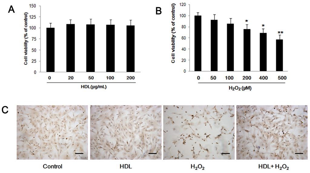 We, therefore, investigated whether HDL could protect MSCs against oxidative stress-induced apoptosis. Additionally, we also examine the effect of HDL on the MSCs senescence, which was regarded to be induced by oxidative stress and to influence cell therapeutic potential considerably. Previously, the effects of HDL on endothelial progenitor cells [12], embryonic stem cells [13], hematopoietic stem cells [14] and induced pluripotent stem cells [13] have been reported, but to date there are no data describing the influence of HDL in the biological activity of MSCs. In the present study, we testified the impact of preconditioning with HDL on MSCs apoptosis and senescence induced by oxidative stress. In addition, hydrogen peroxide (H2O2), which is widely used as an oxidant [4,15], was applied in vitro to induce a form of cellular damage similar to oxidative stress.