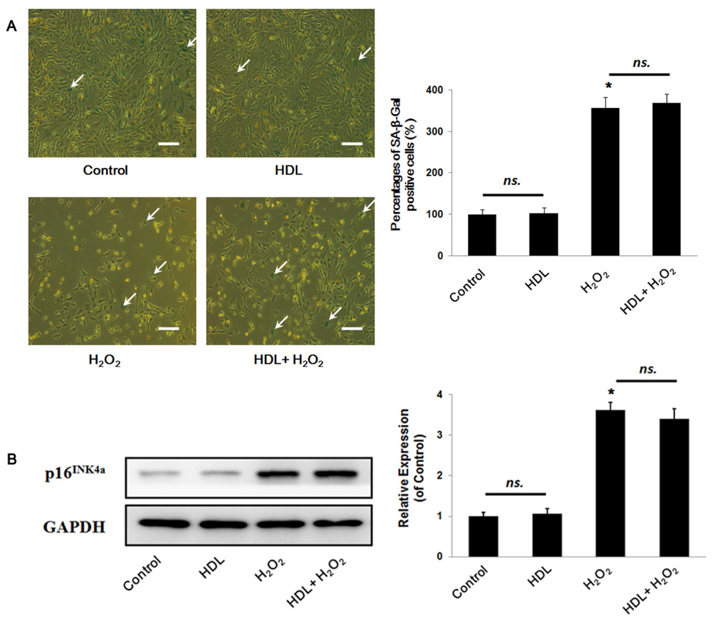 Influence of HDL in the MSC senescence. MSCs were treated with or without HDL for 24 h followed by exposure to H2O2 insult for another 24 h or not; (A) Senescence-associated β-Galactosidase staining and representative photograms from three independent experiments are displayed (scale bar = 20 μm); (B) The expressions of p16INK4a were detected by Western blot analysis and representative bands are shown. Data are shown as mean ± SE from three independent experiments. *p < 0.05 vs. Control group, ns., not significant; GAPDH, glyceraldehyde 3-phosphate dehydrogenase.