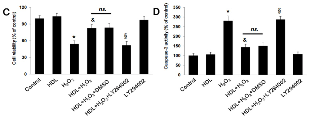 Role of PI3K/Akt pathway in the HDL induced anti-apoptotic protection. (A) Western blot analysis show that HDL significantly increased Akt phosphorylation in MSCs. (B to D) MSCs were pre-incubated with LY294002 (25 μM) or DMSO for 1 h and then exposed to HDL (100 μg/mL) followed by exposure to H2O2 (400 μM) for a further 24 h. Western blotting results show that Akt phosphorylation induced by HDL was decreased by pre-incubation with LY294002. The protective effect of HDL evidenced by cell viability and caspase-3 activity was significantly abolished by LY294002. Results were confirmed in three, independent experiments. *p < 0.05 vs. Control, **p < 0.01 vs. Control, and p < 0.05 vs. H2O2 group, § p < 0.05 vs. HDL + H2O2 + DMSO group, ns., not significant; DMSO, Dimethyl sulfoxide.