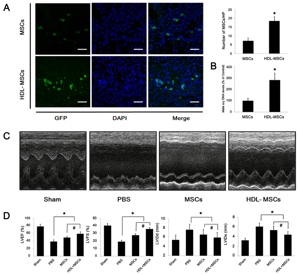 Effects of HDL preconditioning on transplanted MSCs survival and cardiac function in the rats with experimental MI. (A and B) The number of GFP+ MCSs was counted under fluorescent microscopy four days after injection. Representative photomicrographs (A, scale bar = 100 μm) and the corresponding histogram are displayed. Male sry DNA was examined by real-time PCR. n = 7 per group. *p < 0.05 vs. MSCs group. (C and D) four weeks after therapeutic intervention, transthoracic echocardiography was performed to evaluate cardiac remodeling and LV function. Representative M-mode echocardiograms and quantitative data are shown. n = 8 per group. * p < 0.05 vs. PBS group, # p < 0.05 vs. MSCs group.