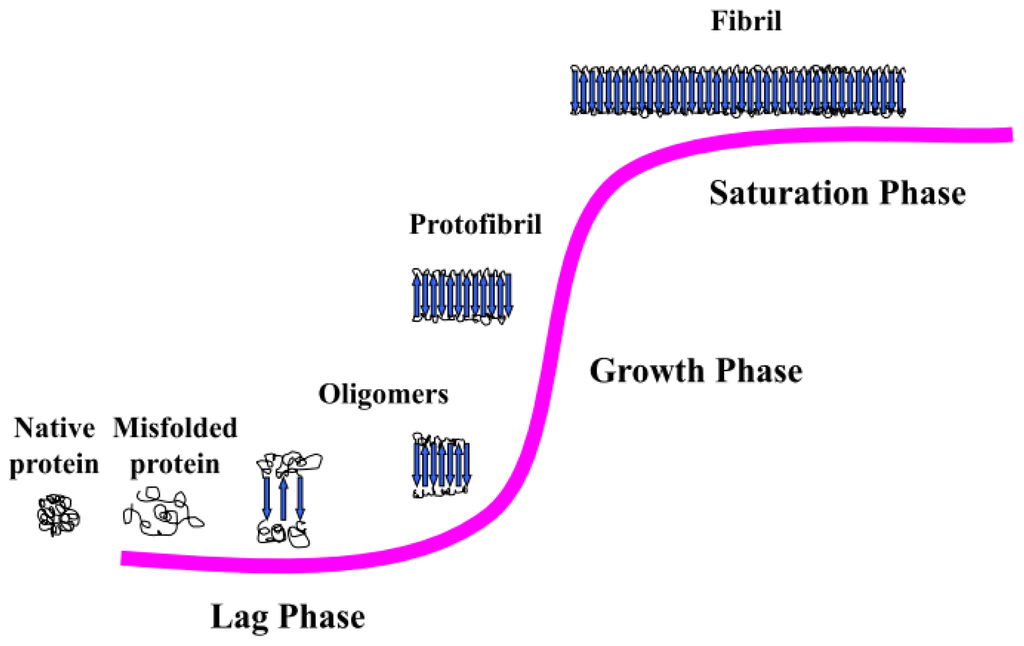 Fibril formation is a polymerization process which can be simply described by a sigmoid curve, suggested to be a three-stage process consisting of protein misfolding, nucleation, and fibril elongation [28] (Figure 1).