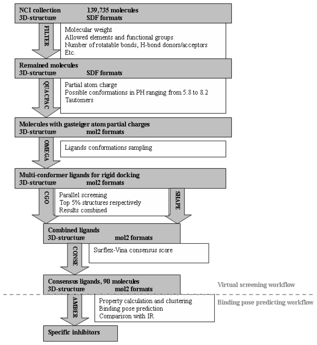The ligand database was established based on a pool of 139,735 compounds in SD format from DTP []. Compounds were filtered by FILTER of OpenEye, using “blockbuster” solution with several parameters altered to relax restrictions. Qualified compounds were sent to QUACPAC to calculate possible proton states from pH 5.8 to 8.2 and tautomers. Gasteiger-Marsili partial charges were added. A mol2 file containing the produced structures was processed by OMEGA for sample conformations for each ligand.