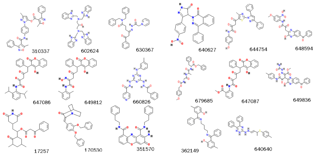 Based on our observations, we identified compounds as potential selective inhibitors of IGF1R if they formed at least one H-bond with Lys51 or Glu98/Met100 of IGF1R and had a ring structure near residues 98–100, while showing none of the these interactions with IR. Compounds that formed H-bonds with Lys51 and Glu98/Met100 in parallel should be considered strong potential inhibitors of IGF1R. Compounds that exhibit hydrophobic interactions with Phe65/Phe28 as well as H-bonds with Lys51 and Glu98/Met100 should also be considered as powerful IGF1R inhibitors. According to these rules, 17 of 90 compounds were selected as potential specific inhibitors of IGF1R (Figure 10). Among these, three compounds (351570, 660826 and 649812) were considered as very powerful inhibitors of IGF1R.