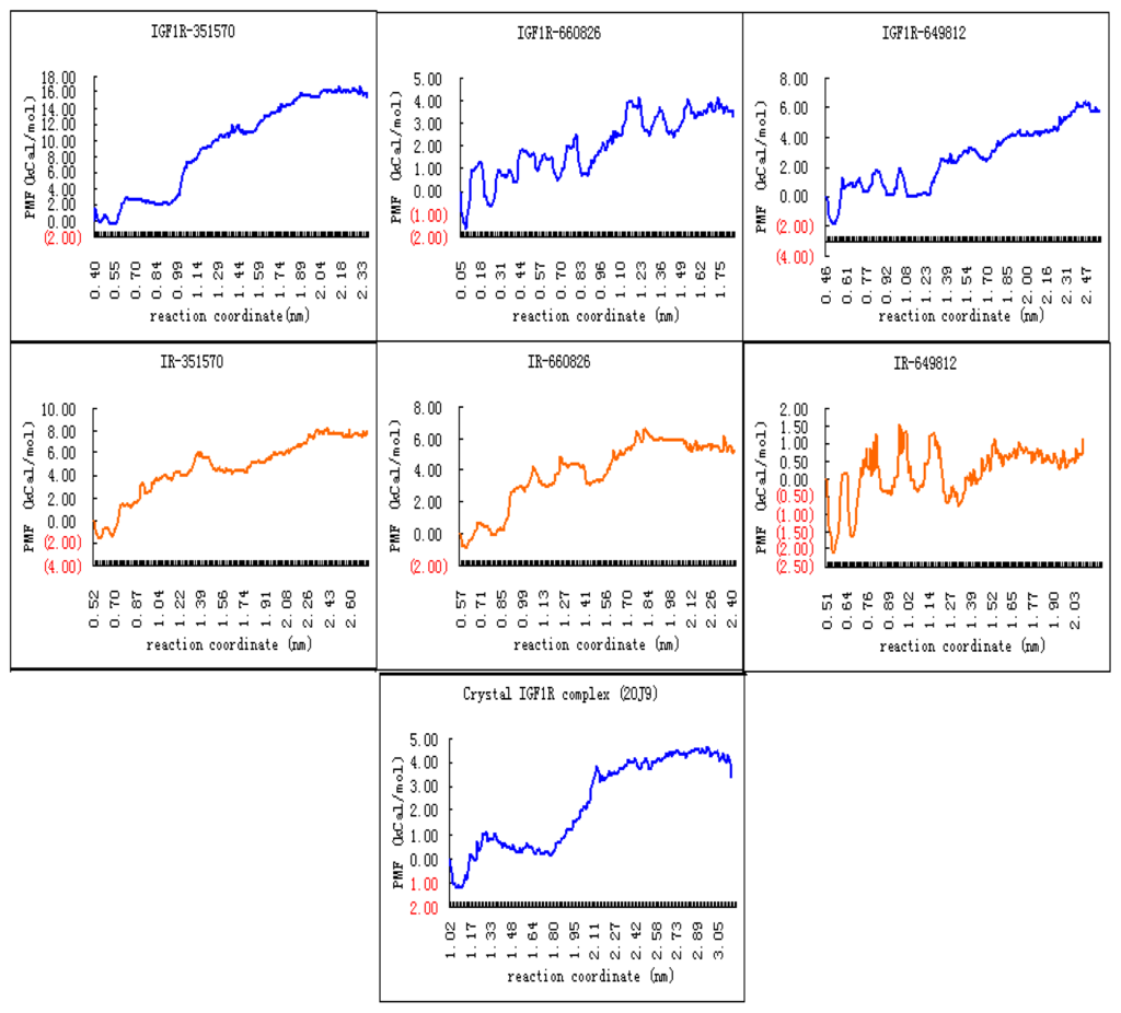The potential of mean force (PMF) curves of the three compounds complexing with IGF1R and IR and the known ligand of IGF1R (2OJ9).