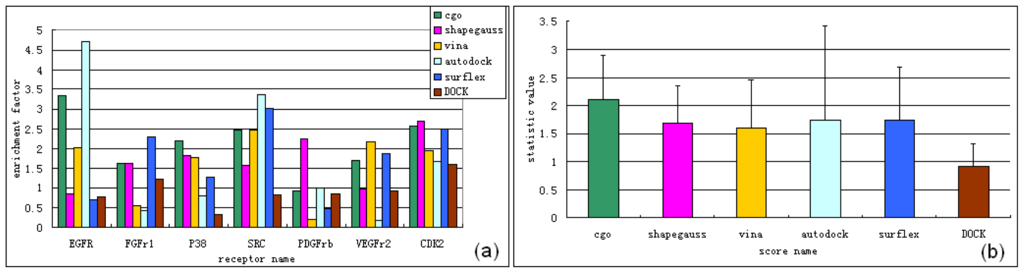Known-binding-ligands-enrichment ability of chosen software against seven kinase receptors. Statistic analysis was performed in top 20% of the rank. (a) enrichment factors (EFs) of ligands docking to seven kinase receptors by chosen softwares; (b) Average value and SD of software’s docking EFs (taking from Figure 2a) among seven kinase receptors.