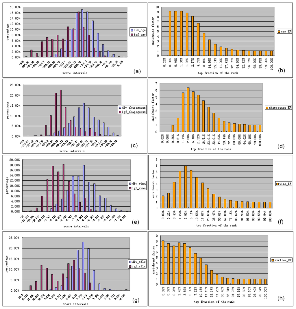 Score distributions of known inhibitors and random ligands generated by (a–b) cgo, (c–d) shapegauss, (e–f) Vina and (g–h) Surflex. Results of known inhibitor collections were recorded as “igf” and that of random ligands or diversity set III were recorded as “div”.