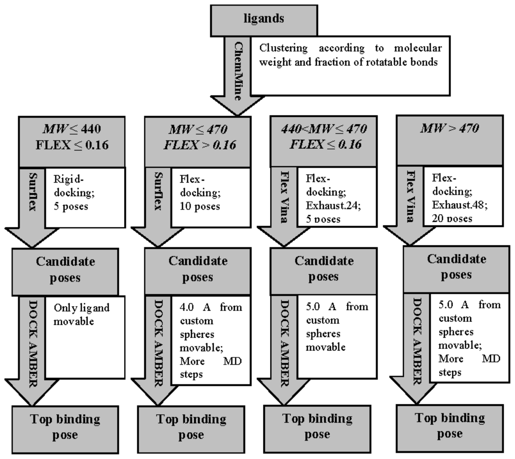 Ligands with many rotatable bonds could be a challenge to docking software because of the increased difficulty in predicting correct ligand binding positions []. This motivated us to create the binding mode-predicting workflow that accounted for the physiochemical characteristics of ligands. MD is a good method for studying molecular interactions, including the analysis of ligand-receptor binding conformations. MD has been implanted into docking packages such as the AMBER score in UCSF DOCK. However, because of the heavy calculation burden of AMBER scoring during MD simulation, using the AMBER score for virtual screening of a large ligand database is impractical. In our workflow, we adopted different docking strategies to predict binding modes of ligands, according to ligand clustering. In particular, the AMBER score was introduced for ligands with high molecular weight and high flexibility. Because of the limited number of available ligands, our clustering analysis was mainly dependent on molecular weight and fraction of rotatable bonds. This simple method might not be appropriate for all ligands and receptors. Further improvements are needed, such as finding additional characteristics for grouping ligands correctly.