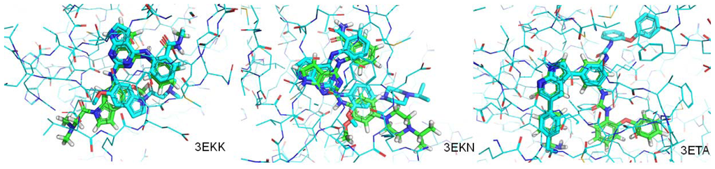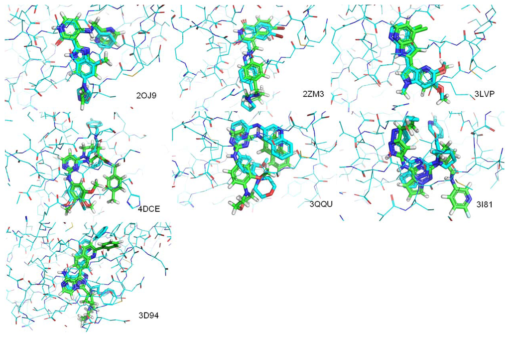 Comparisons of crystal and predicted poses of ligands from seven IGF1R complexes. Pictures were made by Pymol V0.99 []. Atoms were colored according to their type. Cyan lines represents protein residues of IGF1R, cyan sticks represents crystal poses of ligands, and green sticks represents predicted pose of ligands.