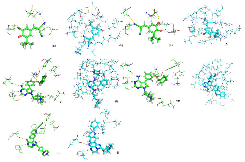 Comparisons of binding poses of reported selective inhibitors against IGF1R and IR. As shown in (a–j), atoms were colored according to their type. Protein residues were represented by lines and ligands were represented by sticks. Green lines and sticks exhibit ligands’ binding poses in IGF1R active site, while cyan ones exhibit ligands’ binding poses in IR active site. Yellow dash lines indicate H-bonds automatically exhibited by Pymol while the one with a number on it indicate H-bond that was not identified by Pymol V0.99 [].