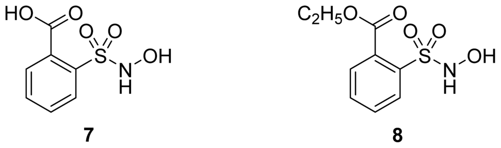 Figure 10. The chemical structures of 2-hydroxysulfamoylbenzoic acid (7) and ethyl 2-hydroxysulfamoylbenzoate (8). - Biava et al. (2012) reported a novel class of diarylpyrrole acetic acid derivatives, which possess the typical scaffold of classic selective COX-2 inhibitors (Figure 11). The researchers showed that 9, its hydroxyethyl and hydroxypropyl ester intermediates (10a and 10b), and their corresponding nitrate esters (11a and 11b) were all potent selective COX-2 inhibitors in vitro (IC50 = 0.019-0.083 μM) and considerably more selective than celecoxib. None of the esters (10a, 10b, 11a, and 11b) were claimed by the authors to be prodrugs of 9. Furthermore, molecular docking experiments have shown that the alcohol group in 10a and 10b and one of the oxygen atoms of the nitrates in 11a and 11b form one or more hydrogen bonds with amino acid side chains in the active site of COX-2. Furthermore, the nitrate ester 11a exhibited an in vitro vasorelaxing effect comparable to that of nitroglycerin [55]. This vasorelaxing effect can be considered the rationale behind designing NO-Coxibs.