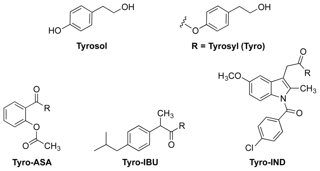 The chemical structures of tyrosol and tyrosyl-NSAID prodrugs Tyro-IBU, Tyro-IBU and Tyro-IND.