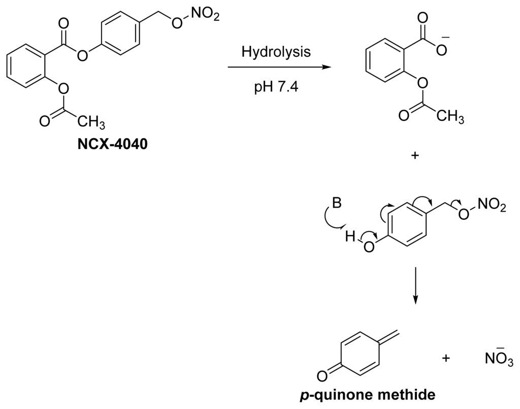 The chemical structure of NCX-4040 and the mechanism of the formation of p-quinone methide.