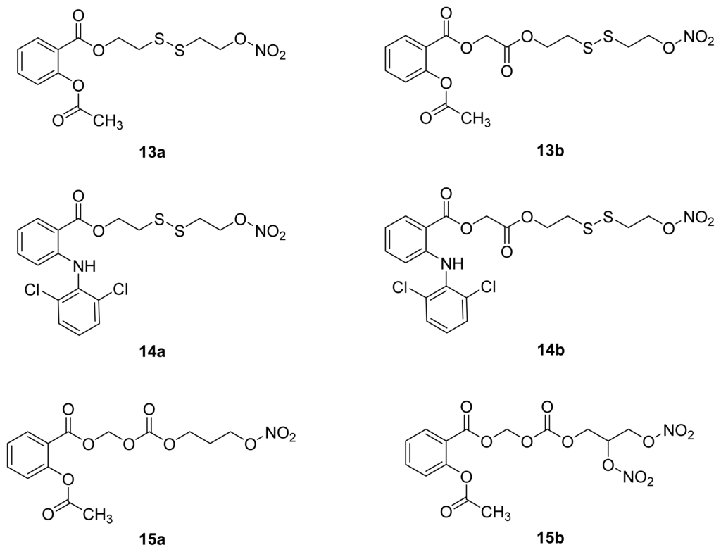 The chemical structures of NO-aspirins and NO-diclofenac prodrugs 13a, 13b, 14a, 14b, 15a and 15b.