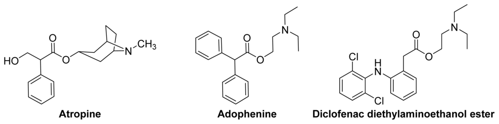 The chemical structures of two anticholinergic compounds, atropine and adophenine and diclofenac diethylaminoethanol ester.