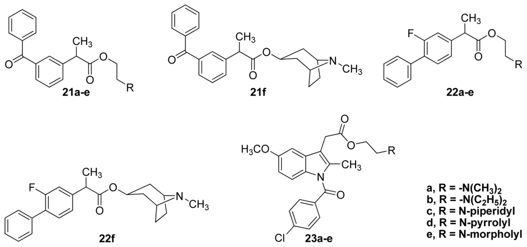 There have been a few examples of these NSAID prodrugs in the literature [71,73,74]. In this regard, aminoethyl esters of ketoprofen 21a–f, flurbiprofen 22a–22f and indomethacin 23a–e incorporating open and cyclic amines were synthesized and evaluated (Figure 18 and Table 2).