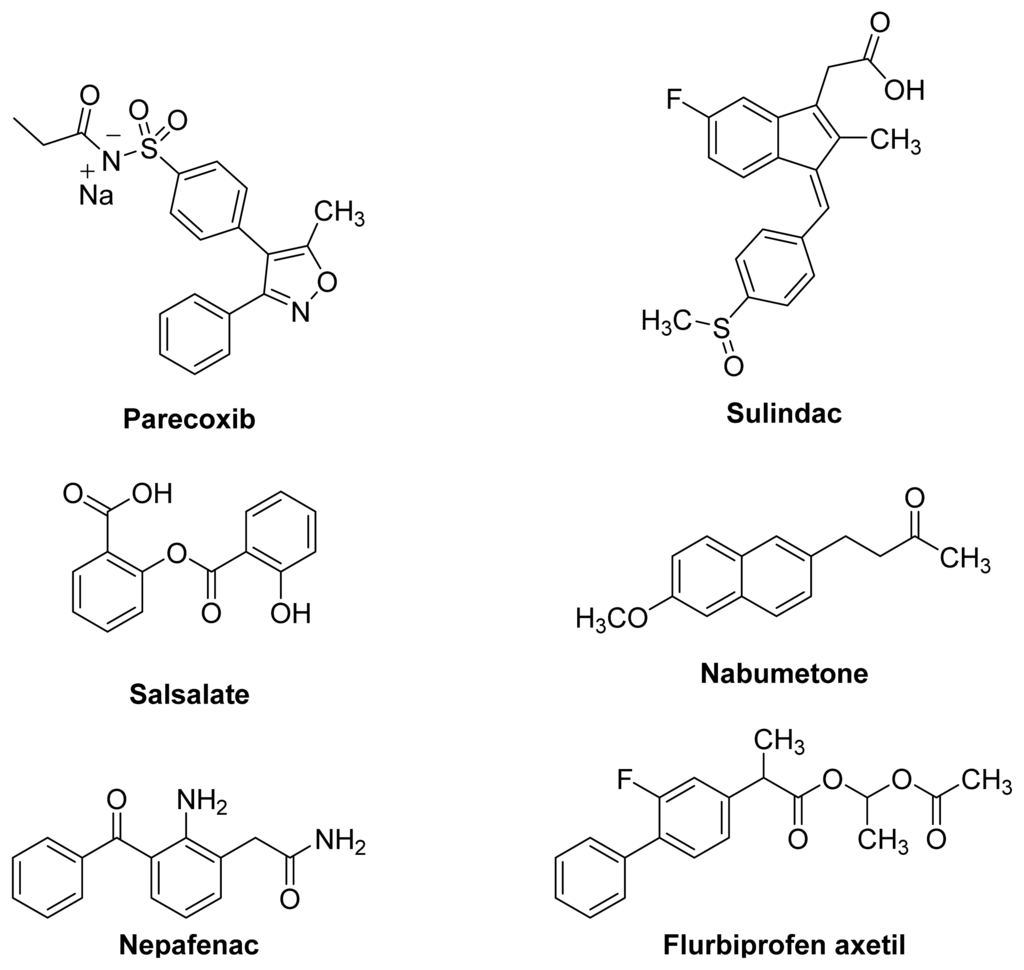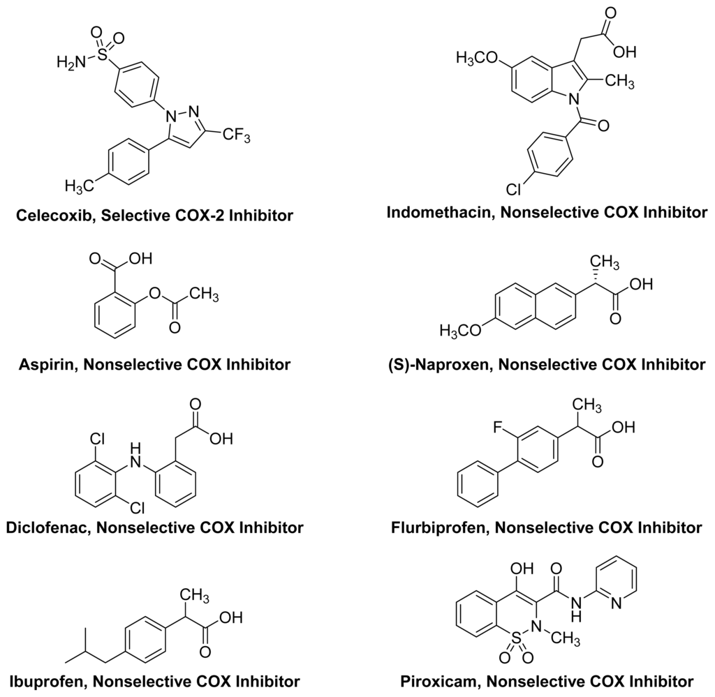 Non-Steroidal Anti-Inflammatory Drugs (NSAIDs) are a diverse group of compounds that are mainly used to reduce fever, pain and inflammation. NSAIDs are among the most frequently used classes of medications, which, as of 2009, represented a market worth more than $9 billion among prescribed medications in the USA [16]. NSAIDs exert their pharmacological action by inhibiting the synthesis of prostaglandins (PGs) by non-selectively blocking cyclooxygenases 1 and 2 (COX-1 and COX-2) or by selectively blocking COX-2. Inhibition of COX-1 is also responsible, in part, for gastrointestinal side effects, which are the most frequent side effects of NSAIDs [17]. Non-selective COX inhibitors have other contributors to their gastrointestinal side effects, which are the carboxylic acid group in compounds, such as aspirin, ibuprofen and diclofenac, and the acidic enolic group in oxicams, such as piroxicam [18]. These acidic groups cause local irritation upon oral administration, which can lead to the clinically observed gastrointestinal side effects either independently or in tandem with inhibition of the COX-1 enzyme. In a recent report, Lanas et al. (2011) have concluded that more than 90% of the treated patients with osteoarthritis are at increased GI risk, with 60% of them at high risk [19]. Selective COX-2 inhibitors, such as celecoxib, have been designed, synthesized and clinically introduced as gastrointestinal (GI)-sparing NSAIDs. These compounds are not devoid of side effects, as they can cause adverse cardiovascular events [20,21]. The chemical structures of some commercially available NSAIDs are shown in Figure 2.