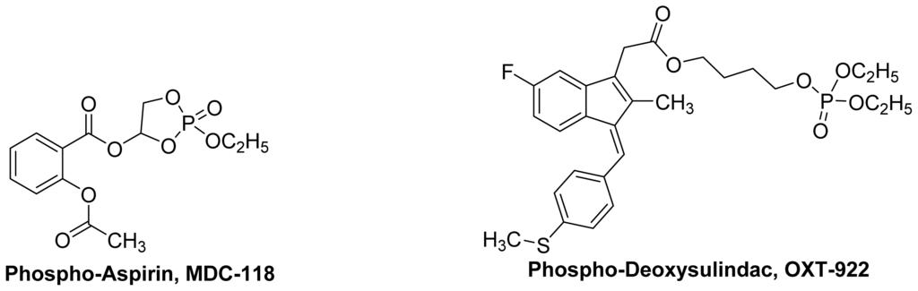 The chemical structures of phospho-aspirin (MDC-118) and phospho-deoxysulindac (MDC-922).