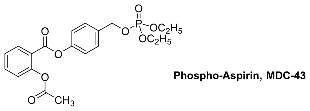 The phospho-aspirin MDC-43 (Figure 22) is reported to be effective against human cancer cell lines [89]. A study of the SAR of MDC-43 and its analogs revealed that the aromatic ring is important for inducing apoptosis. The proposed mechanism of action is similar to that proposed for the NO-NSAID NCX-4040 (Figure 14), which shows aspirin as the promoiety and not the parent drug, and here, the phosphate group plays the role of the leaving group [64]. In this context, MDC-43 and NCX-4040 are regarded as prodrugs for p-quinone methide [90].