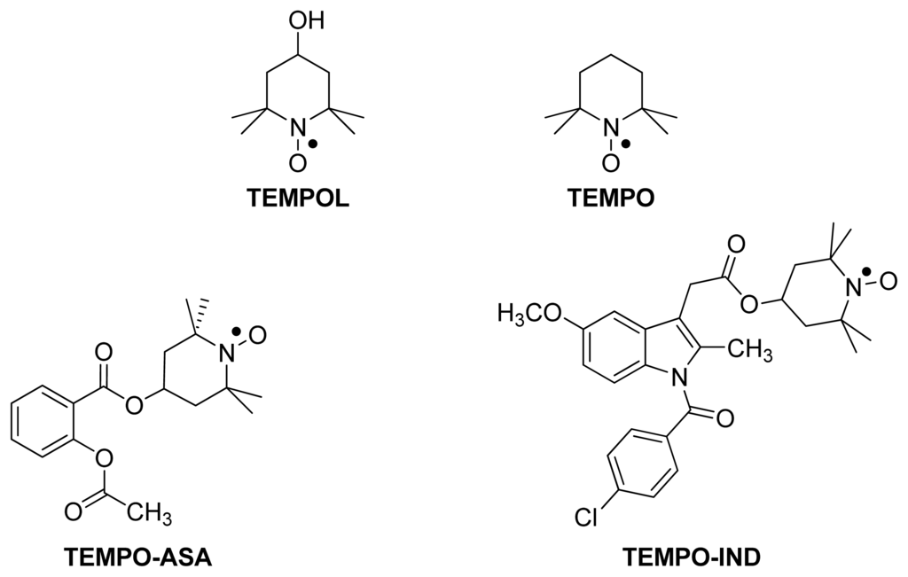 2,2,6,6-Tetramethyl-1-piperidinyloxy (TEMPO) and 4-hydroxy-TEMPO (TEMPOL) (Figure 23) are chemically stable nitroxides (nitroxyl radicals) that can play an antioxidant role through radical-radical or radical-scavenging reactions with Reactive Oxygen Species (ROS). Pharmacologically, TEMPOL has been shown to prevent the aggravation of indomethacin-induced lesions in the stomach [91]. Flores-Santana et al. (2010) have reported the synthesis and the pharmacological evaluation of the TEMPOL ester of aspirin (TEMPO-ASA) and indomethacin (TEMPO-IND) [92], Figure 23.