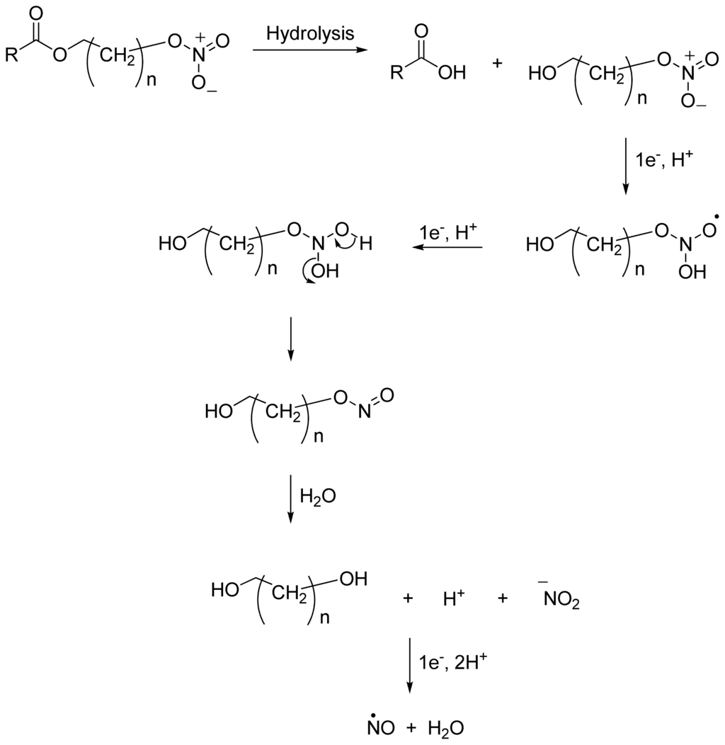 NO-NSAIDs can be defined as codrugs if nitric oxide is considered to be a drug molecule that has its own pharmacological activity, and sometimes, they are given the rather vague designation of hybrid prodrugs. Examples of NO-NSAIDs are numerous in the literature and were summarized in an informative review by Koc and Kucukguzel [28]. Simple NO-NSAIDs consist of an NSAID molecule connected via an alkyl spacer to a nitrate group (-ONO2), as seen in Figure 4, which also illustrates the mechanism of NO release. In vivo, a typical NO-NSAID is initially hydrolyzed into the parent NSAID and a nitrate-containing alcohol. A two-electron reduction cascade of the nitrate group followed by dehydration leads to the formation of a nitrite derivative. Hydrolysis of this nitrite derivative liberates a diol and a nitrite anion. Finally, the nitrite anion is further reduced to afford a nitric oxide molecule [37]. It is believed that the CYP3A4-NADPH-cytochrome P450 reductase system is involved in nitric oxide formation from organic nitrates [38]. In addition to nitrates, other NO-releasing groups have been incorporated in NO-NSAIDs [39–47], a summary of which can be found in Table 1.