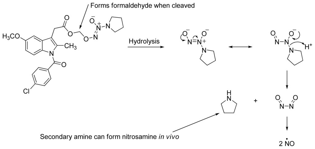 With regard to NO-NSAIDs, the gastroprotective effect of these prodrugs is assumed to be due to the release of NO in vivo. This assumption may be questioned after considering a comparison conducted by Chattopadhyay et al. (2010) between the in vivo safety profiles of nitrate and NONOate-containing NSAID prodrugs [48]. The researchers found that there were no significant differences between the safety profiles of both groups of NO-NSAIDS, which led to the conclusion that the amount of NO released per prodrug molecule may not be the only determining factor in the gastroprotective effect of these prodrugs [48].