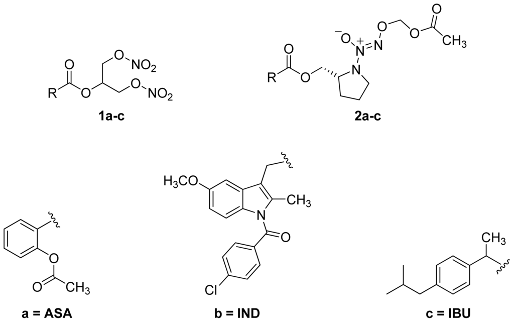 - A group of glyceryl dinitrate esters (1a–c) and NONOate-containing prodrugs (2a–c) of aspirin (a = ASA), indomethacin (b = IND) and ibuprofen (c = IBU) (Figure 7) have been synthesized and evaluated in vivo and in vitro for their anti-inflammatory activity [52]. Although the ibuprofen and indomethacin esters showed in vivo activity comparable to their parent NSAIDs, the aspirin esters showed less than half the activity of aspirin. Furthermore, none of them showed in vitro inhibitory activity against COX-1; rather, they all showed inhibitory activity against COX-2 (in vitro IC50 = 0.6–9.3 μM) that was comparable to or greater than that of their parent NSAIDs. These results pose two questions: was the in vivo biological activity of these compounds due solely to the parent NSAIDs? And, second, was the GI-sparing profile only the result of NO release?