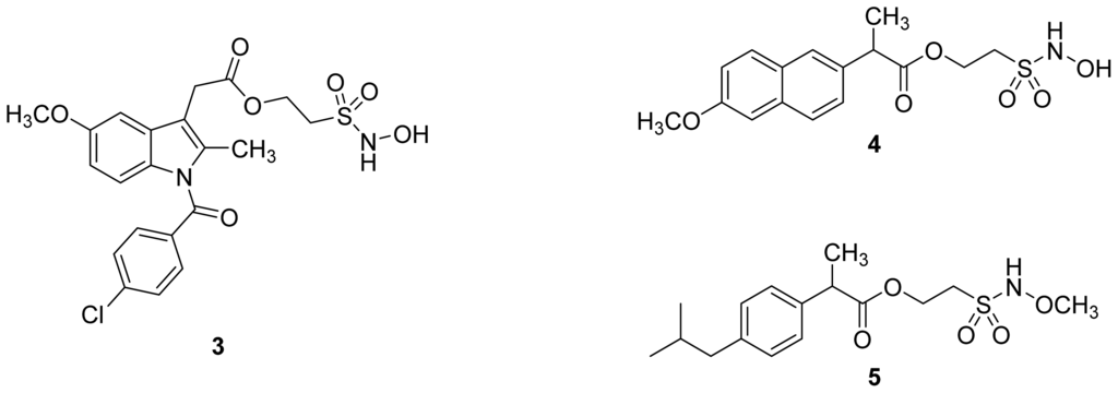 Figure 8. Chemical structures of the ethanesulfohydroxamic acid esters of indomethacin (3) and naproxen (4) and the methyl ether of ibuprofen ethansulfonhydroxamic acid ester (5). - The ester of diclofenac (6) (Figure 9) contains benzofuroxan as the NO-releasing group. Ester 6 was synthesized and evaluated in vitro and in vivo for the reduction of PGE2 and TXB2 levels in plasma. This ester was found to be more effective in inhibiting PGE2 synthesis than TXB2 synthesis in vitro. This finding suggests that this NO-diclofenac ester is more selective for COX-2 [46].