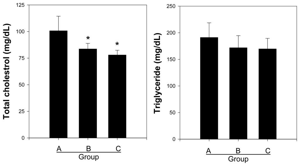 The total cholesterol and triglyceride levels were evaluated in the blood samples from the rats of each group. As shown in Figure 2, the crude polysaccharide (Group B, 83.62 ± 5.25 mg/dL) and acidic polysaccharide (Group C, 78.00 ± 4.42 mg/dL) groups demonstrated significantly decreased total cholesterol levels compared to the control (Group A, 100.7 ± 13.68 mg/dL). Interestingly, the acidic polysaccharides exhibited a greater reduction, by approximately 5%, in the total cholesterol induced by a high-fat diet, as compared with the crude polysaccharide extract. According to our previous results, the crude polysaccharide and acidic polysaccharide extracts from Gastrodia rhizome have different compositions [26]. Thus, we suggest that the above results were due to the different chemical compositions between crude and acidic polysaccharide extracts. However, there were no differences in the serum triglyceride levels among the control, crude polysaccharides and acidic polysaccharides. It was an interesting result that both the crude polysaccharide (Group B) and acidic polysaccharide (Group C) oral administrated groups suppressed total cholesterol on the high fat diet compared with control (Group A).