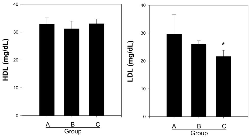 As shown in Figure 3, non-high fat diet groups showed no increased in the physiological concentration of serum HDL and LDL levels, whereas serum LDL cholesterol was higher in the control group, at 29.67 mg/dL, than in the treatment groups (Group B, 26.04 mg/dL and Group C, 21.06 mg/dL). In particular, the administration of the acidic polysaccharides significantly decreased the LDL cholesterol by 12.3% compared to the control group. However, there were no significant differences in the serum HDL cholesterol levels among the control (Group A, 32.92 ± 2.19 mg/dL) or the crude (Group B, 31.20 ± 2.73 mg/dL) or acidic polysaccharide (Group C, 33.01 ± 1.69 mg/dL) groups.