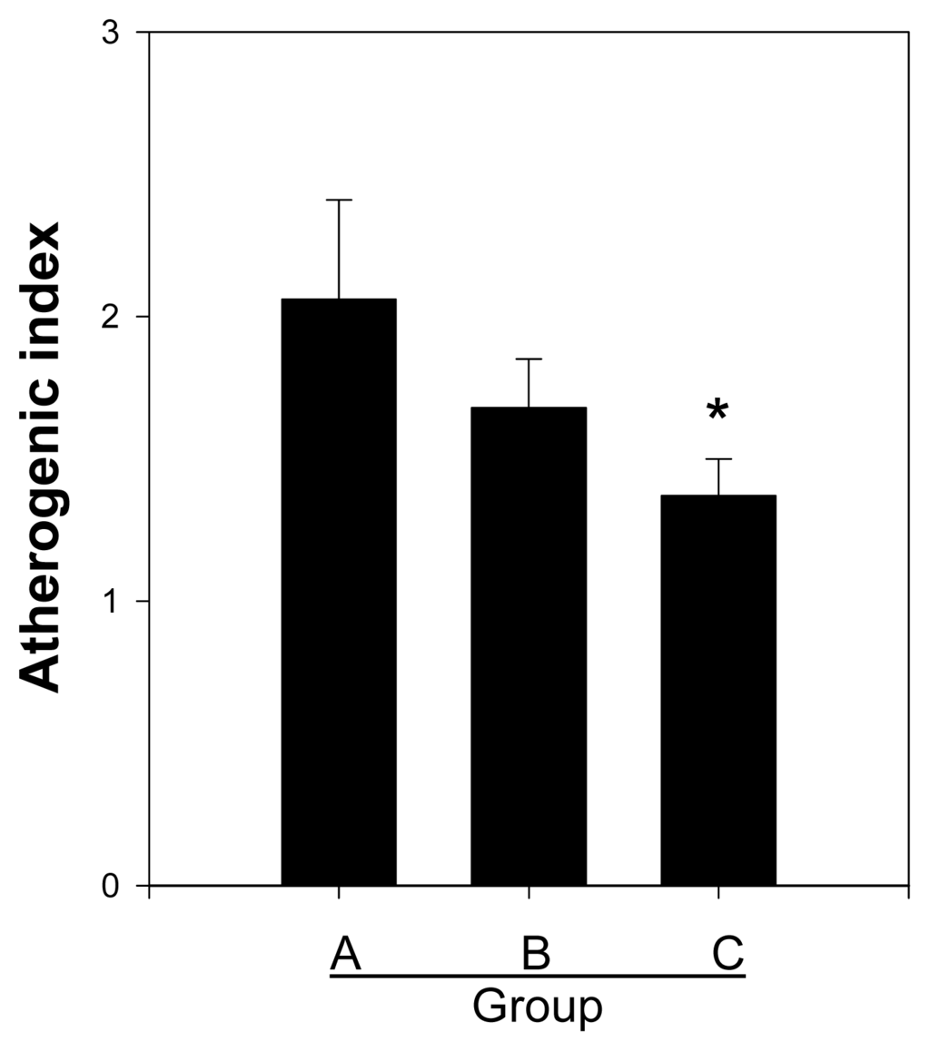 To determine the effect of the crude and acidic polysaccharides on atherosclerosis in SD rats fed a high-fat diet, the atherogenic index was evaluated, as described in the experimental section. Figure 4 shows the average value of the atherogenic index of the control (Group A) and the crude polysaccharide (Group B) and acidic polysaccharide (Group C) treatment groups. The control (Group A, high fat diet) group demonstrated an index of 2.06 mg/dL, which was the highest value in our experiment, whereas the index for the crude polysaccharide group was 18.45% lower than the control, and the index of the acidic polysaccharide group was significantly decreased, by 32.95%, compared with the control. These results indicated that the acidic polysaccharide extract has an inhibitory effect on atherosclerosis in SD rats fed a high-fat diet.