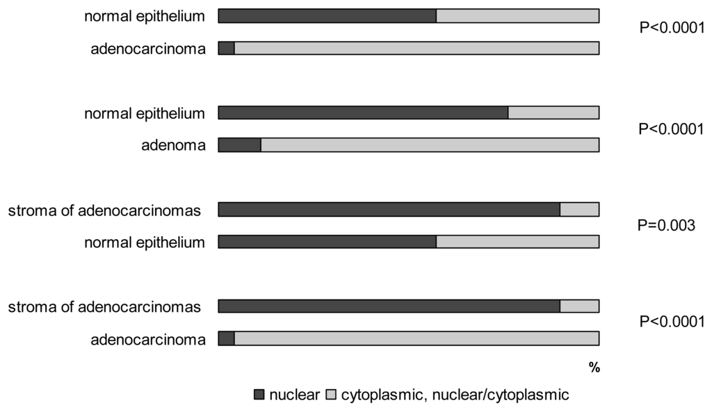 The staining of protein expression in neoplastic cells was compared to that of normal epithelium and tumor grade. Furthermore, tumor stroma was compared to the surrounding stroma of normal epithelium and protein levels were also compared between adenomas and adenocarcinomas. The assessment was evaluated by Fisher’s exact test. Associations between binary categories were analyzed using the chi-square test. P-values of 0.05 or less were considered to be statistically significant.
