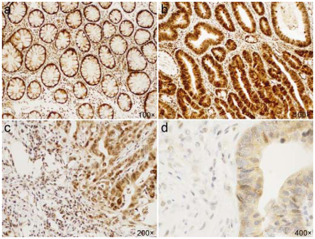 Immunohistochemical staining of Snail-1. (a) Nuclear expression in normal colonic epithelium; (b) Combined nuclear/cytoplasmic expression, with predominating nuclear localization in adenoma; (c) Combined nuclear/cytoplasmic expression in adenocarcinoma; (d) Purely cytoplasmic expression in adenocarcinoma.