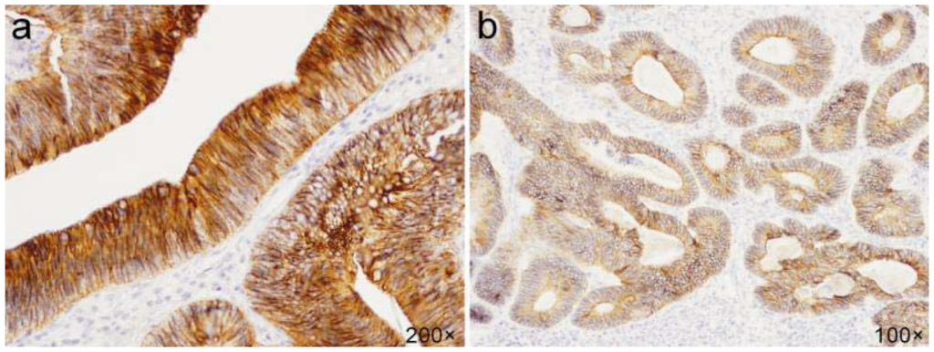 Immunohistochemical staining of E-cadherin. (a) Strong membranous expression in adenoma; (b) Moderate membranous expression in adenocarcinoma.