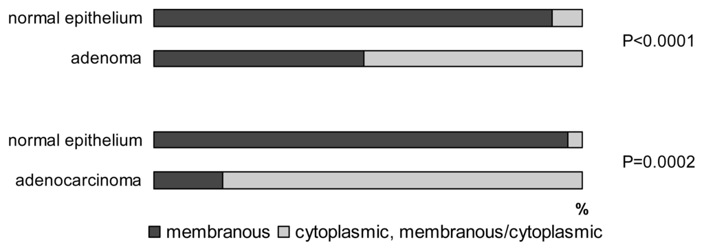 In tumor cells of adenocarcinomas and adenomas, prevailing strong positivity of claudin-1 was detected, without significant quantitative differences between the two groups. Claudin-1 was expressed in significantly higher levels in adenomas (p = 0.034) and adenocarcinomas (p = 0.005), comparing with normal epithelium. No differences were observed concerning the grade of carcinomas. Marked differences were seen in protein localization (Figure 4), where membranous staining, typical for nontumorous epithelium, changed to combined membranous/cytoplasmic expression in adenocarcinomas (p = 0.0001) and adenomas (0.0002), where cytoplasmic shift was associated with a higher degree of dysplasia. Furthermore, membranous/cytoplasmic localization was more frequent in the carcinoma group (87%) in comparison with adenomas (51%) (p = 0.0001).