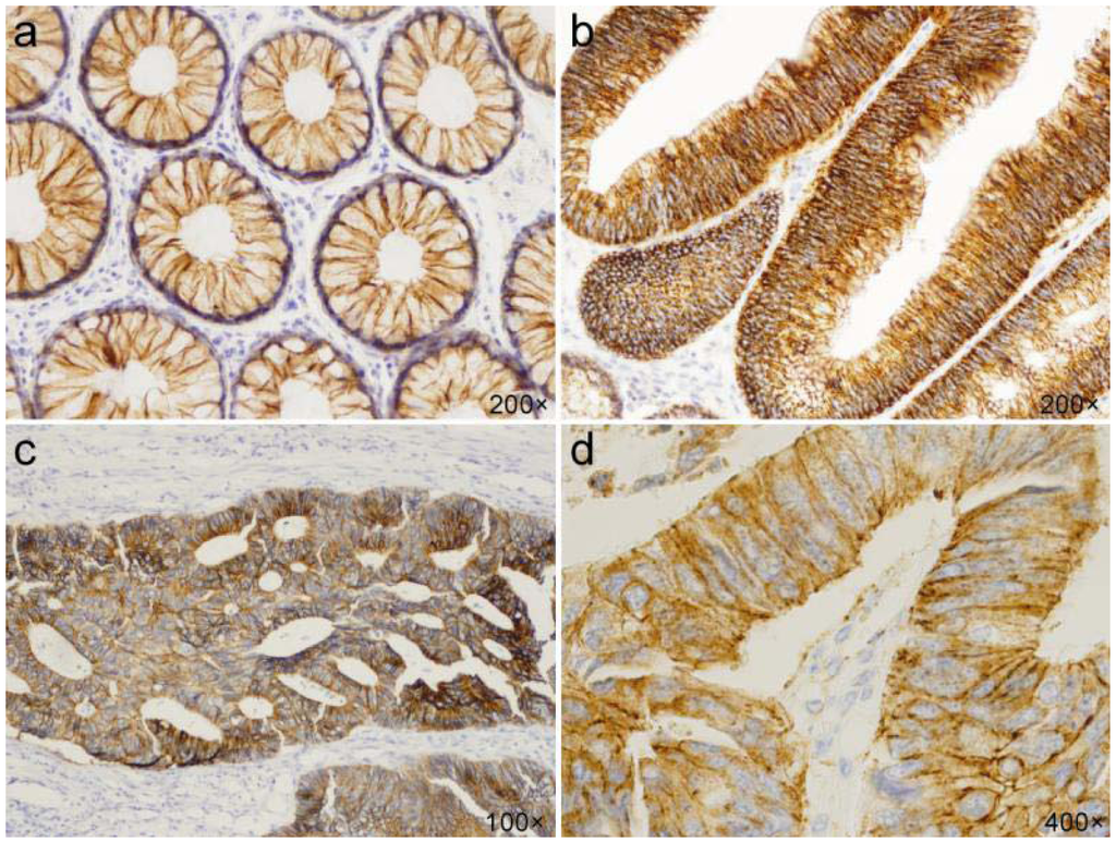 Immunohistochemical staining of claudin-1. (a) Membranous expression in normal epithelium; (b) Strong membranous expression in adenoma; (c) Combined membranous/cytoplasmic expression in adenocarcinoma; (d) Cytoplasmic expression in adenocarcinoma.