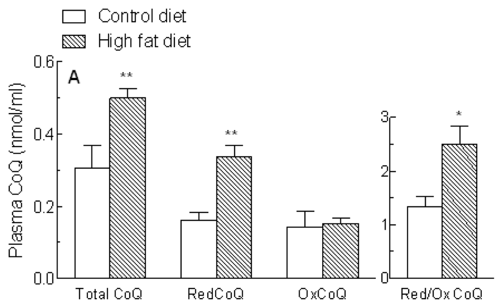Our findings indicate that high fat diet-induced NAFLD in rats leads to a marked increase in the plasma content of the antioxidant CoQ, and that this is entirely due to an increase in the levels of CoQ9, which is synthesised endogenously in rats, rather than obtained from the diet. This rise in CoQ9 synthesis is likely to be an adaptive response to the oxidative stress associated with NAFLD [22,25,26]. In addition, protein, but not lipid, oxidative stress is increased. The increase in CoQ levels may help to prevent increased lipid peroxidation and to counter a reduction in antioxidants in these animals.