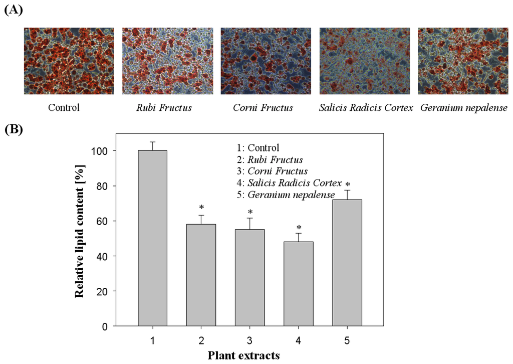 Rubi Fructus, the unripe fruit of Rubus Chingii Hu belonging to the Rosaceae family, can be found in many parts of the Asia, especially in China. In general, Rubi Fructus has estrogenic effect, promote lymphocyte proliferation and elevate testosterone level by promoting the activity of steroid synthesizing enzymes and by inhibiting their degradation [23]. Corni Fructus, the pulp of Cornus officinalis sieb. belonging to the Cornaceae in family, can be found in China, Japan and Korea. The biological activity of Corni Fructus was reported to relieve cyclophosphamid-induced leukopenia and to have antibacterial effects [24]. Salicis Radicis Cortex belonging to the Ulmaceae in family was reported to have antioxidant, antitumor, antimetastatic effects [25], to increase NO synthase activity [26], to lower LDL cholesterol levels [27], to prevent cancer development and metastasis [28] and to be effective in wound healing, angiogenesis, and cardiovascular disease [29]. Geranium Nepalense belonging to the Geraniaceae in family was reported to have antibacterial and antifungal effects [30]. Even though these four plants have reported to have various biological activities, there was no report indicating them to have lipid inhibitory activity.