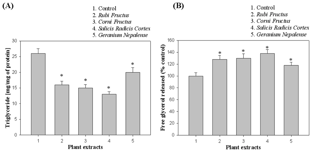 As shown in Figure 3A, lipid accumulation was measured based on the TG contents of 3T3-L1 cells differentiated in the presence of natural extracts. Furthermore, the lipolysis was assessed through the measurement of glycerol released in culture medium for 24 h incubation, as shown in Figure 3B. The four natural extracts that exhibited inhibitory activity towards pancreatic lipase (Rubi Fructus, Corni Fructus, Salicis Radicis Cortex, and Geranium nepalense) were found to inhibit triglyceride accumulation in 3T3-L1 adipocytes and trigger lipid metabolism process to glycerol release.