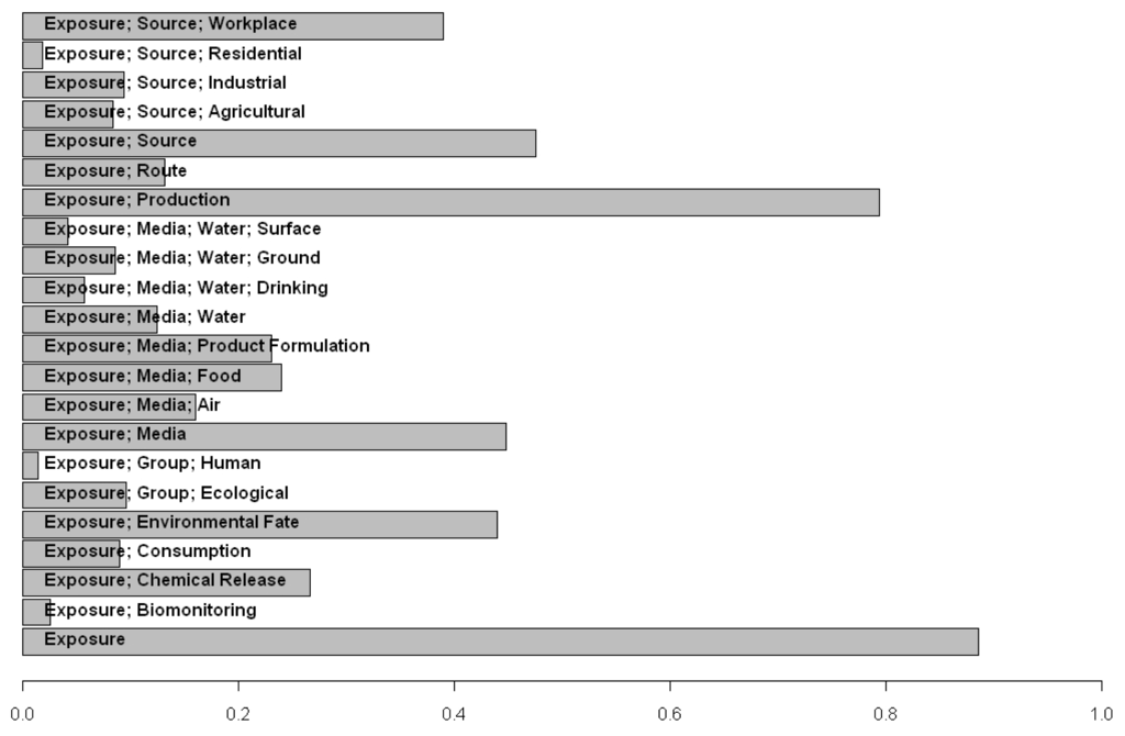 ACToR has been used to assess the data gaps for particular inventories of chemicals, determining the types of detailed analyses currently possible and aiding in the prioritizing of data generation moving forward. As an example of this type of application, ACToR was queried to locate the fraction of chemicals in a targeted inventory that had specified categories of exposure data from any source. The targeted inventory consisted of all chemicals (~8700 total chemicals) that were pesticide actives or inert ingredients, or potential water contaminants (the EPA Candidate Contaminant List (CCL) Universe). This particular target inventory is subject to the EPA Endocrine Disruptor Screening Program (EDSP) [31]. Figure 10 summarizes the results of the query in terms of the fraction of the inventory having any potentially relevant data. Approximately 40% of these chemicals have some workplace exposure data, whereas only a few have the corresponding residential exposure data. Production volume data is available for >80% of compounds in the target inventory, indicating that most of these are manufactured or imported in relatively large quantities [32].
