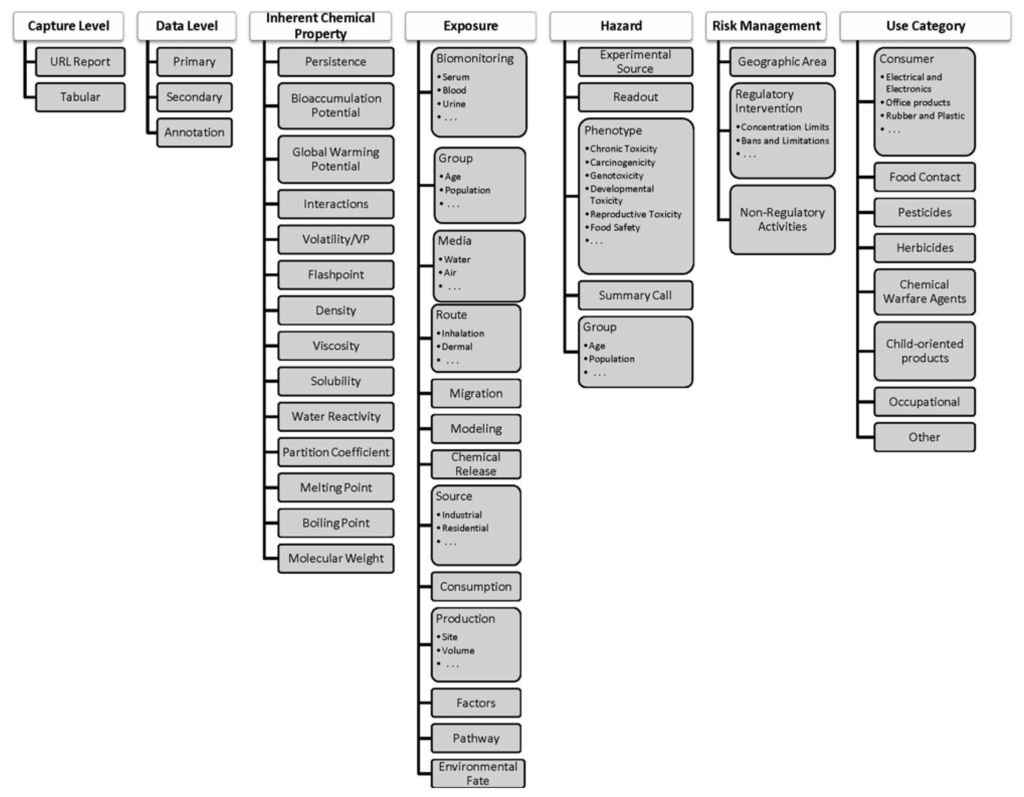 Exposure categories are employed to facilitate consolidation of key exposure metrics. These include data describing exposure sources (industrial releases, consumer product use, etc.), environmental fate, chemical levels in environmental and biological media (indoor air, soil, drinking water, urine, serum, etc.), and exposure route (inhalation, dermal, absorption, ingestion). Use categories are employed to indicate how the chemicals are typically used within industry and the commercial realm (e.g., pesticides, pharmaceuticals, surfactants), which is useful information for exposure models. Finally, risk management categories carry information that pertains to expert judgment-based evaluation and perceptions of risk, such as derived safe exposure limits, thresholds of toxicological concern, etc.