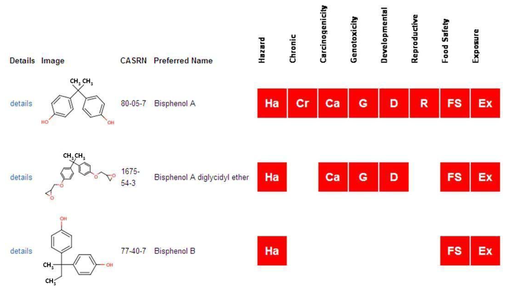 ICP describes properties that are inherent to the chemical and its structure, typically independent of biological target interactions, or that can be predicted using chemical structure models (QSARs). Examples of the former are molecular weight and boiling point, whereas examples of the latter are bioaccumulation potential or octanol water partition coefficient. “Hazard” largely describes data that are associated directly or indirectly with toxicology experiments. An example of the former would be a data collection of experimental results compiled from the literature such as provided by the Carcinogenic Potency Database [7] (a secondary source). An example of the latter would be an IRIS (Integrated Risk Information System) [8] or IARC (International Agency for Research on Cancer) [9] category or recommendation that considers a large body of experimental data in the literature. The experimental source may be an in vivo or in vitro experiment and the high-level phenotype being investigated may be carcinogenicity, developmental toxicity, etc.