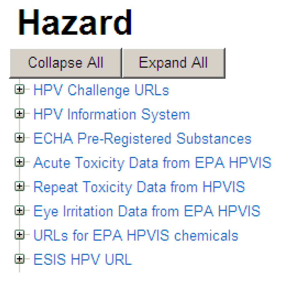 By selecting the “details” link to the left of the chemical structure, a user is presented with headers leading to a listing of the full data captured within ACToR. As an example, a portion of the data for Zinc dibutyldithiocarbamate is shown in Figure 4. The top section lists some of the overall Hazard data sets including data from the EPA, the EU, Health Canada and the National Library of Medicine. By selecting the “+” sign next to a data set, a user can access successive layers of detail pertaining to actual data and/or URLs linking to the data source.