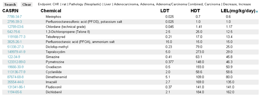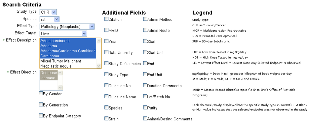 The primary search tool currently available within the ToxRefDB system is located in the “Search By Endpoint” tab. The page allows the user to select, from the standardized effect vocabulary, the exact search criteria of interest as well as the additional field information to be displayed (Figure 6). The results of searching, for example “Chronic/Cancer Rat Liver Neoplastic Pathology” returns the lowest effect level (LEL) in mg/kg/day dose that represents the lowest dose at which a treatment-related change in the selected effect or effects was observed (Figure 7). Each row from the returned search represents a unique study in ToxRefDB, with the low and high dose tested (LDT and HDT) provided for reference. If multiple effects are selected, a single LEL is returned which aggregates all selected effects with a primary goal of providing the field of predictive toxicology a tool for rapidly defining endpoints across a large chemical library. The endpoint search tool can also be used for researchers interested in delineating a set of reference chemicals with positive and negative outcomes for a particular effect or in vivo endpoint.