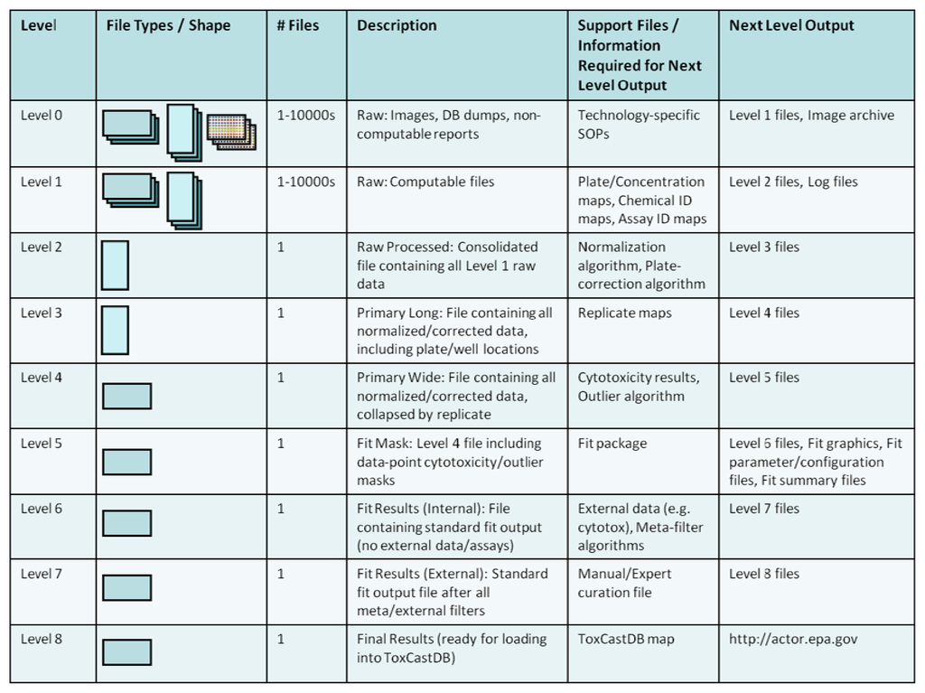 Figure 8 shows the levels at which data are tracked and created as they move through the workflow. The various levels are linked by scripts written in the R language so that they can be run on any machine by any member of the workflow team. Scripts linking certain key levels also generate auxiliary support files for archival, QA, and accounting purposes that include information on chemicals tested, assays included, data-fit summaries, etc. Proceeding through the workflow levels in Figure 8, “Raw” data (Level 0 or Level 1) may be received in a variety of formats, depending on the assay platform. Custom parsing scripts consolidate incoming data into analysis-ready files by reshaping and linking the blinded solution IDs sent to assay providers with DSSTox chemical substance annotations. Next, analysis proceeds through normalization, plate-correction, outlier detection, curve-fitting (estimating AC50s), and post-filtering. The post-filtering includes automated algorithms that use meta-data from other assays, as well as formalized manual curation of results. The end result is a standardized set of output (graphics plus files) containing AC50 estimates, model parameters, and assay “hit” criteria (i.e., overall positive or negative assay call) that are loaded into ToxCastDB.