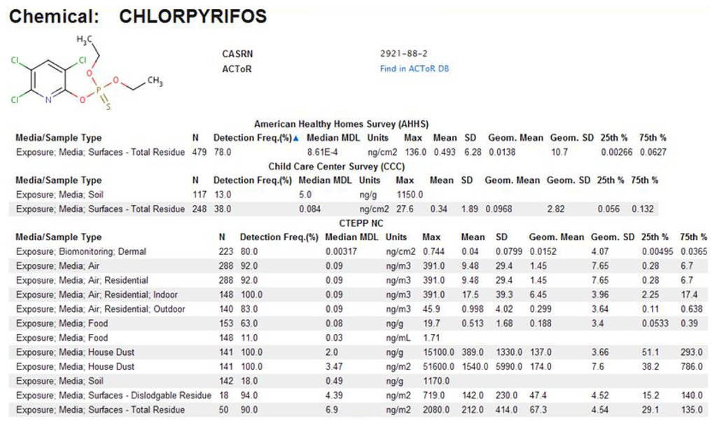 In ExpoCastDB, chemical concentration data are organized by study, chemical and media type. General information about the individual studies as well as study-specific data can be accessed through the Study List page. Links are provided to descriptive statistics on chemical concentration (median method detection limit, max, mean, standard deviation, geometric mean, geometric standard deviation, and 25th and 75th percentile) for each of the chemicals in each medium sampled. The entire set of hierarchical data (extracted from the database) from each individual study is available for download from this page. Descriptive statistics can also be directly accessed for individual chemicals through the Chemical List page, or for individual exposure medium through the Media List page. For example, descriptive statistics for chloropyrifos concentrations in different media from all three studies can be accessed on the Chemical List page (Figure 9). The primary search tool currently available within the ExpoCastDB system is located on the Home page where information can be obtained by entering the chemical name or CASRN.